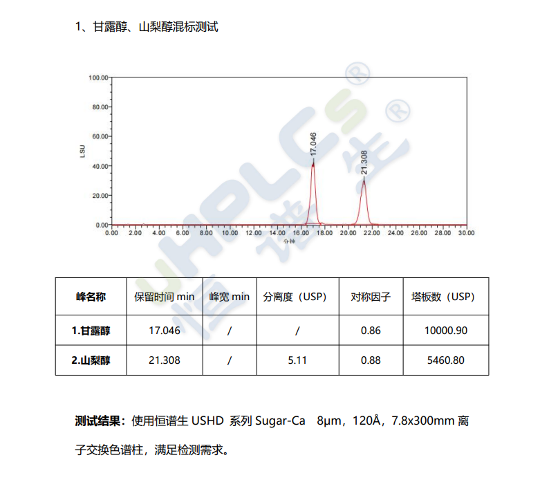 ? ?分離精準專一:鈣離子配位交換機制,對糖醇類物質(zhì)具有高選擇性,基線分離效果好,定量準確。
